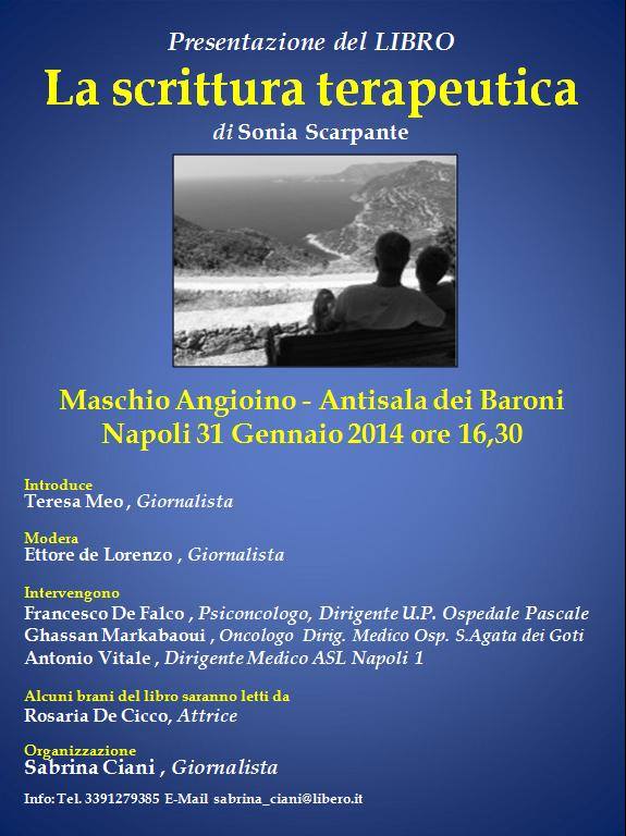Il giorno 31 gennaio 2014 ho presentato a Napoli il mio libro "LA SCRITTURA TERAPEUTICA" presso il Maschio Angioino. Hanno partecipato alla presentazioni medici di varie professionalità.